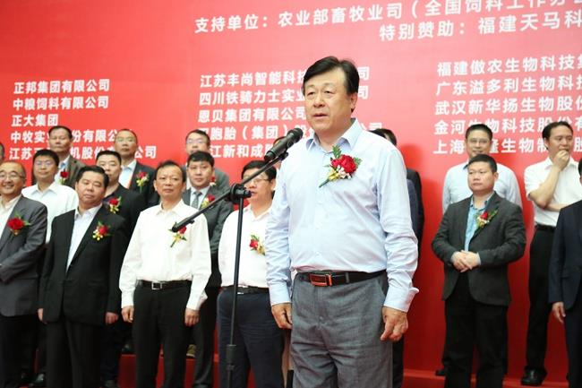 上圖為全國畜牧總站站長、中國飼料工業(yè)協(xié)會秘書長楊振海主持展會開幕式